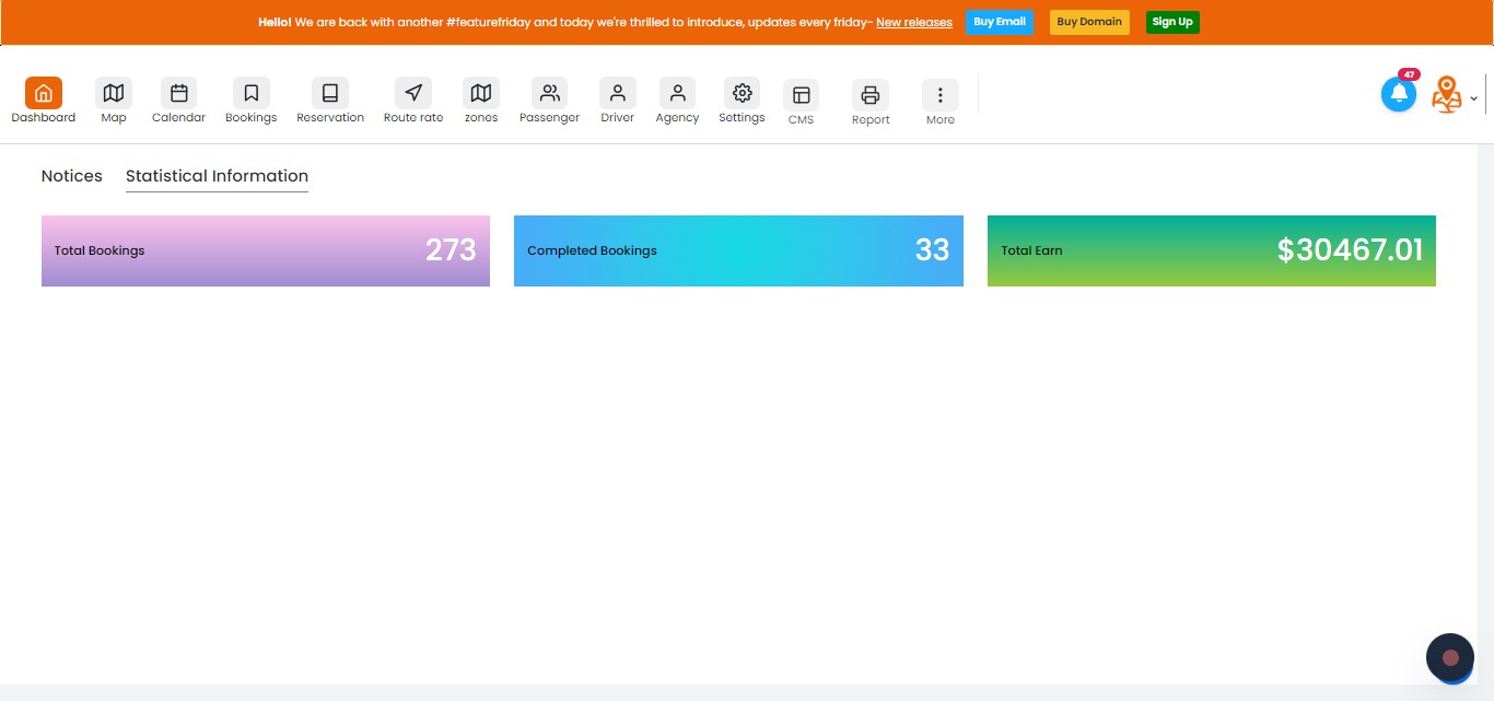 In this 'Statistical Information' sub-section you can view the Total bookings, Completed Bookings in number and Total Earn in amounts .