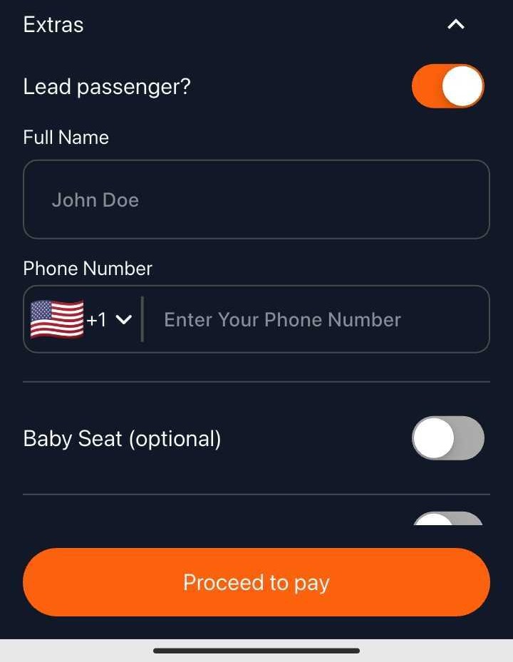 5. Add Flight info, Passenger Count, Luggage, and Extras ( Lead passenger , Baby seat, and instruction if required)_