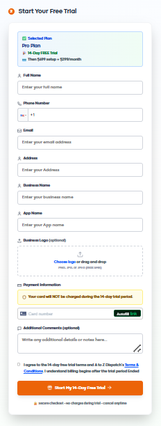 you can sign up for a 14-day free trial. This trial allows you to explore selected Dispatch Plan: Lite, Growth, and Pro.